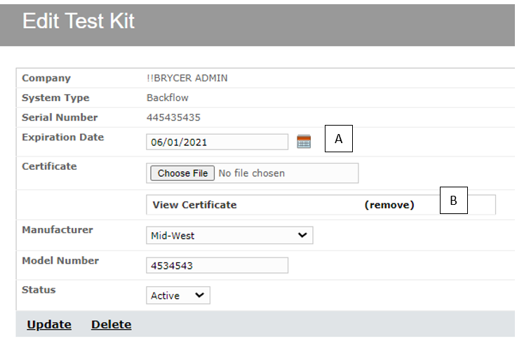 Step 2: Scroll down to the "Test Kits" box. Click on the bolded "Select" button next to the backflow system that needs updating.